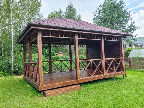 Такие беседки имеют стены, окна и двери, что делает их пригодными для круглогодичного использования. Закрытые беседки могут быть оборудованы системами отопления, освещения и даже кухней. - Полузакрытые беседки
